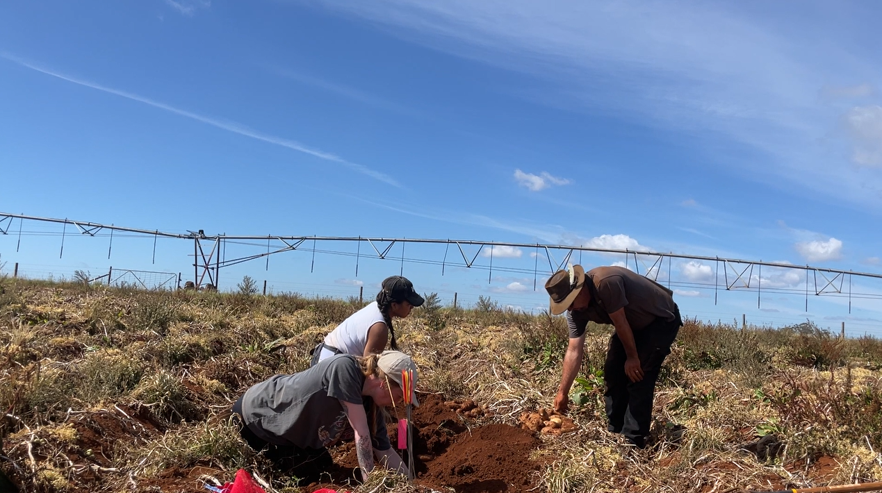 PotatoLink’s Sophia Thach, Tasmanian regional representative Tim Walker, and Ellie harvesting the trial